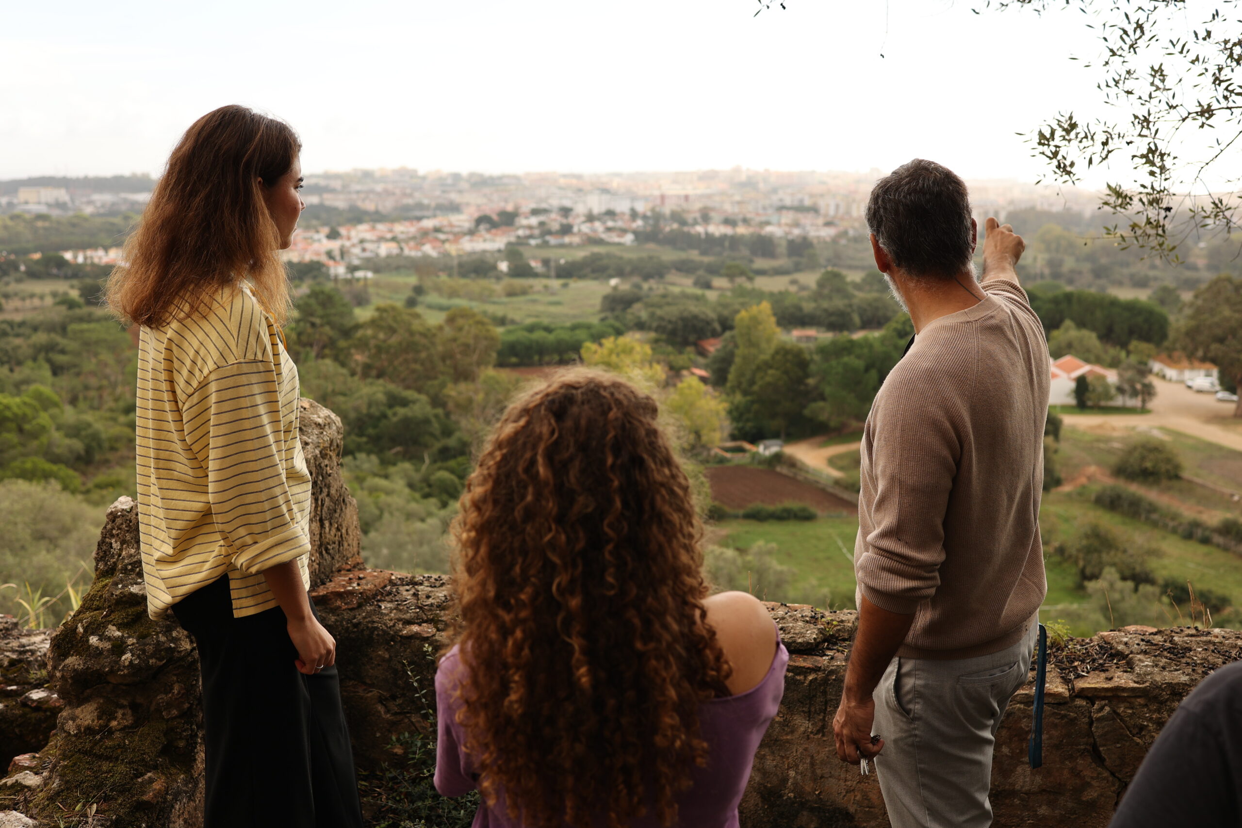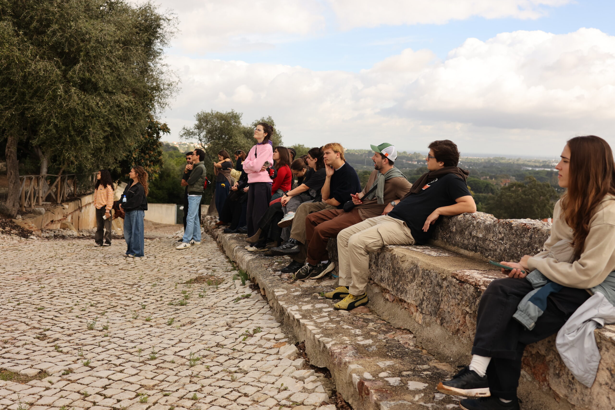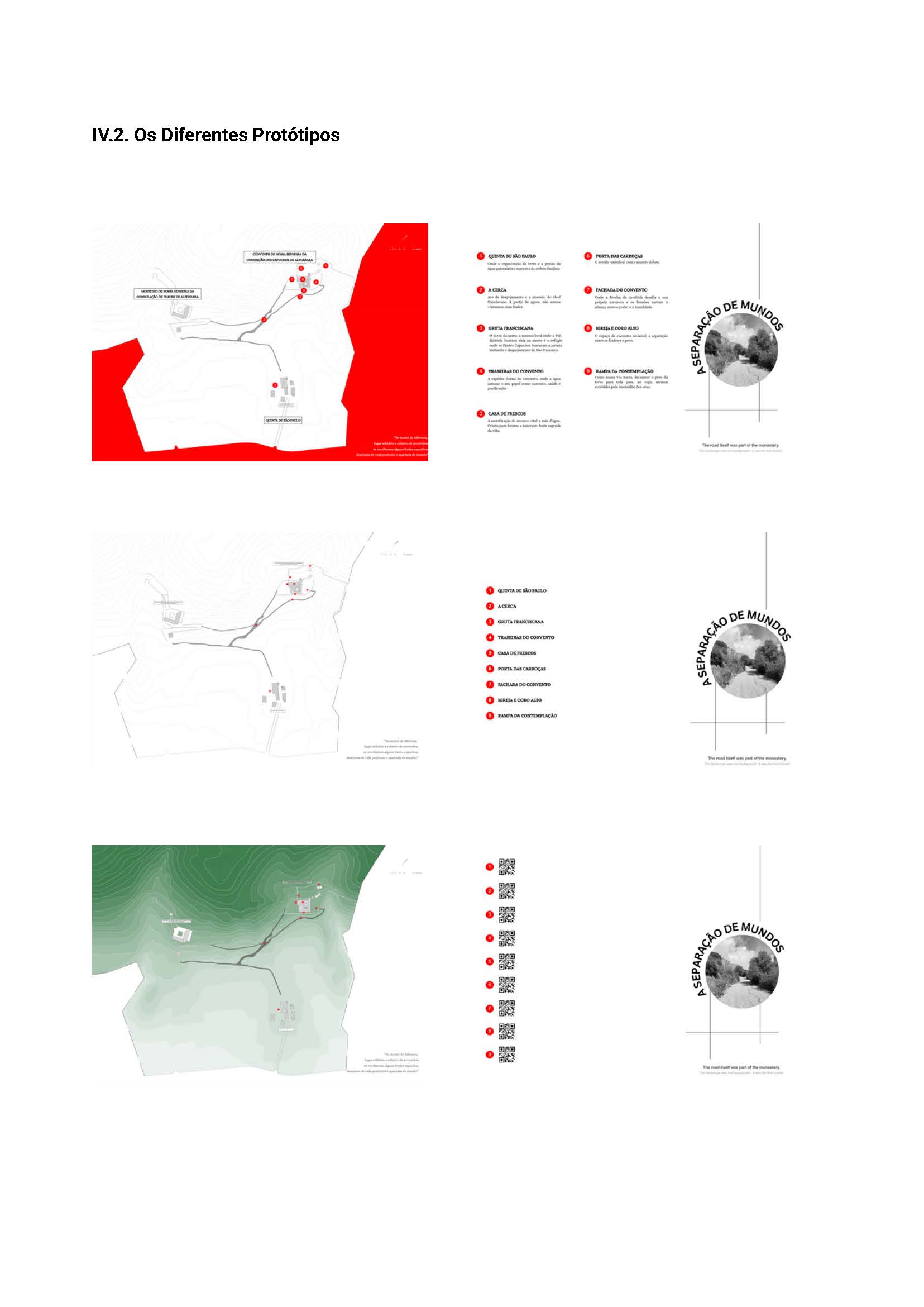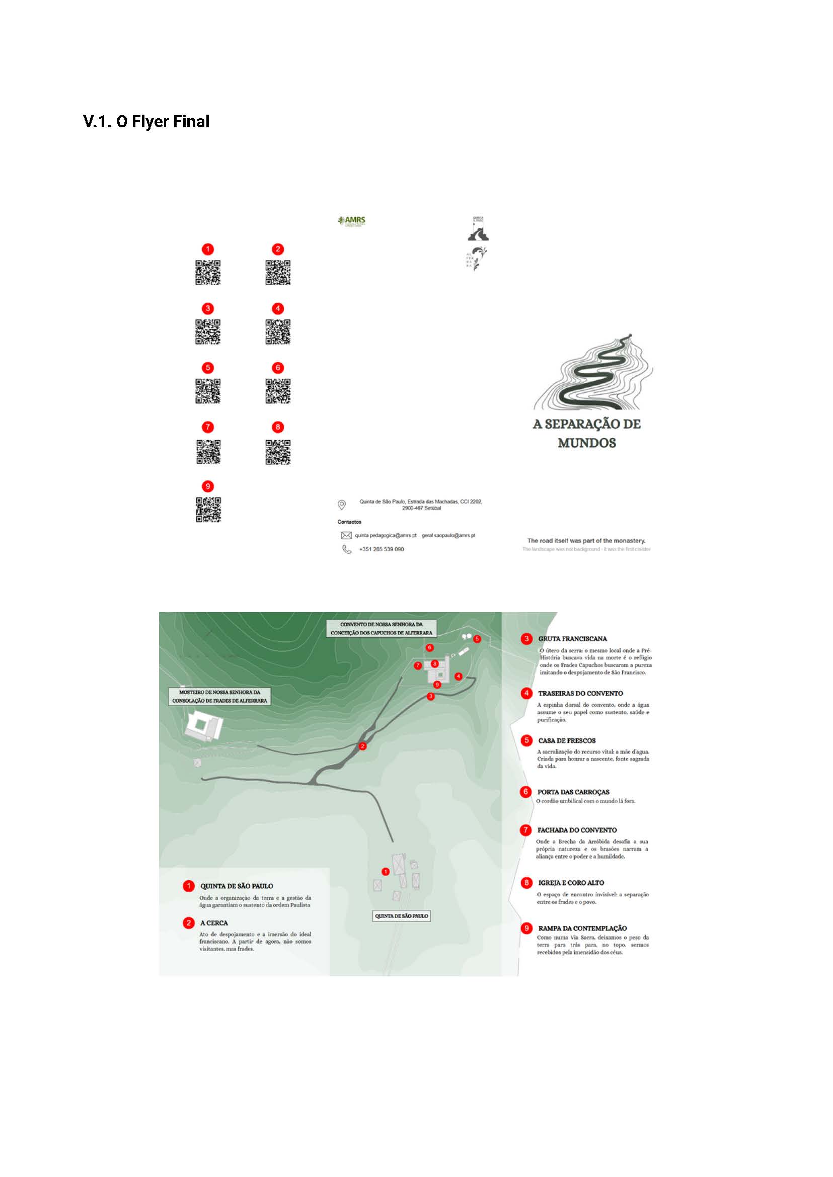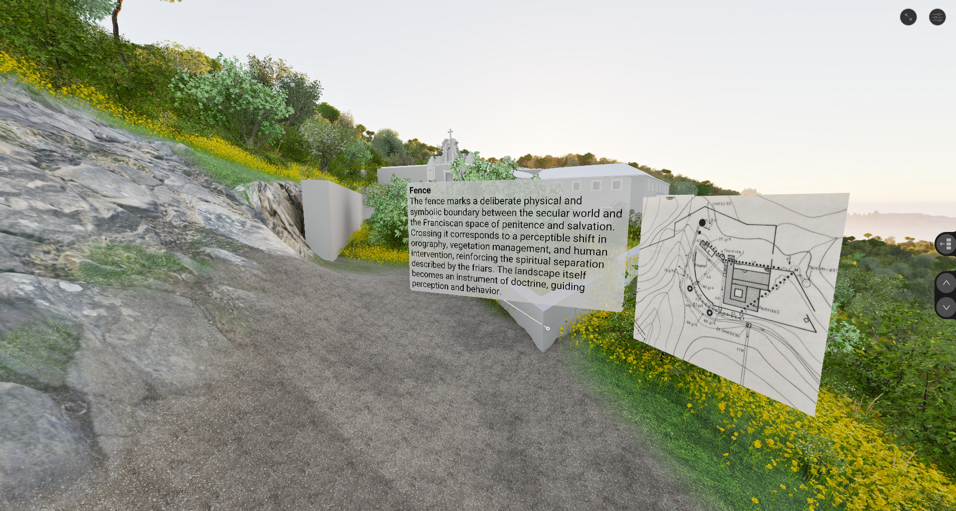 6) Digitally assisted storytelling: This storytelling project for the Capuchos Convent developed a heritage-interpretation strategy that translates historical research into an accessible visitor experience. The process began with theoretical and graphic research, structured through a shared working document to identify the site’s key narratives, emotional qualities, and possible communication formats. An on-site visit transformed the team’s understanding of the convent and its landscape, revealing that a lighter, more immediate format would better support real-time exploration than an HBIM approach. The concept therefore evolved into a visitor flyer organized around a curated route from Quinta de São Paulo to the convent, highlighting key points such as the prehistoric cave, Casa de Frescos, façade, church, and contemplation ramp. The final design combined a mapped itinerary, short evocative texts in an audio-guide tone, and QR codes linking to audio descriptions. Rather than prescribing interpretation, the project frames storytelling as a simple, immersive system that helps visitors construct their own experience of the place, while remaining adaptable to future digital or on-site signage formats.