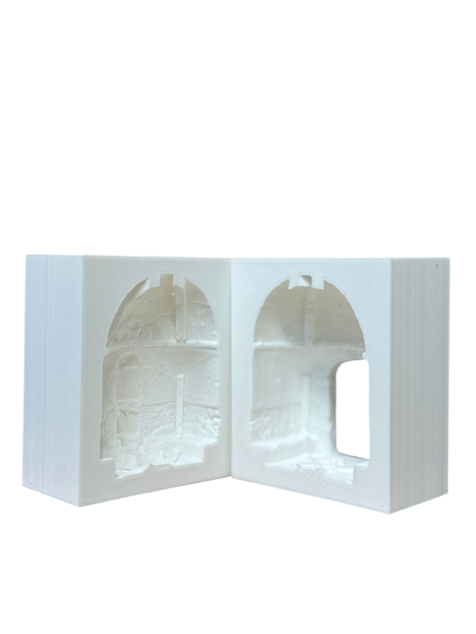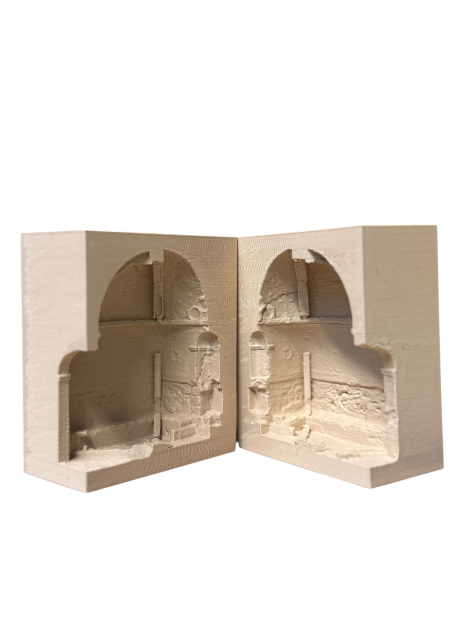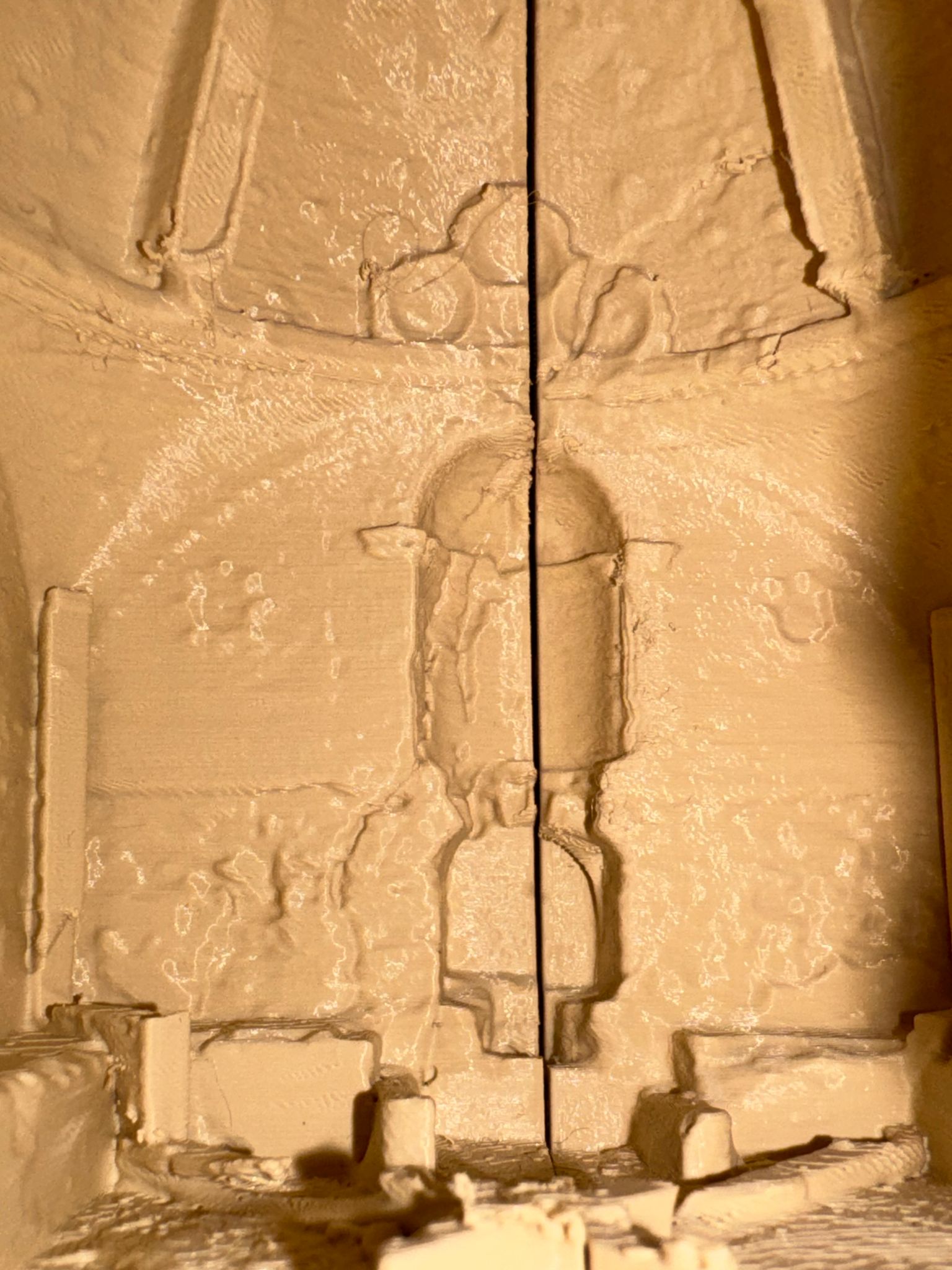 7) 3D printing as-found conditions: This comparative project explored 3D printing as a communication method for as-found documentation using the cooling houses (casas de frescos) of both convents as a common scenario to test different modelling strategies for best representing condition of decay. In Portuguese convents and estates, these cooling structures functioned as retreat spaces, using the cooling effects of moving exposed water and cave-like structures to create environments for rest and refreshment during hot and dry summer months. While the São Paulo cooling house is highly deteriorated and currently stabilized with a temporary timber support, the Capuchos Convent has been more recently restored and thus retains largely regular geometry with only some localized areas of exposed masonry on the façade and interior floor. These differences prompted different digital modelling approaches prior to printing. For the São Paulo case, an all-mesh workflow was used to preserve as much as of the surface distortion, cracking, and irregular material conditions with high fidelity. For the Capuchos case, a hybrid workflow used HBIM solids modelled from point clouds to create the primary architectural volumes with mesh inserts in areas of exposed irregular masonry. The models were then merged and repaired to produce watertight STL files suitable for printing at reduced scales.
