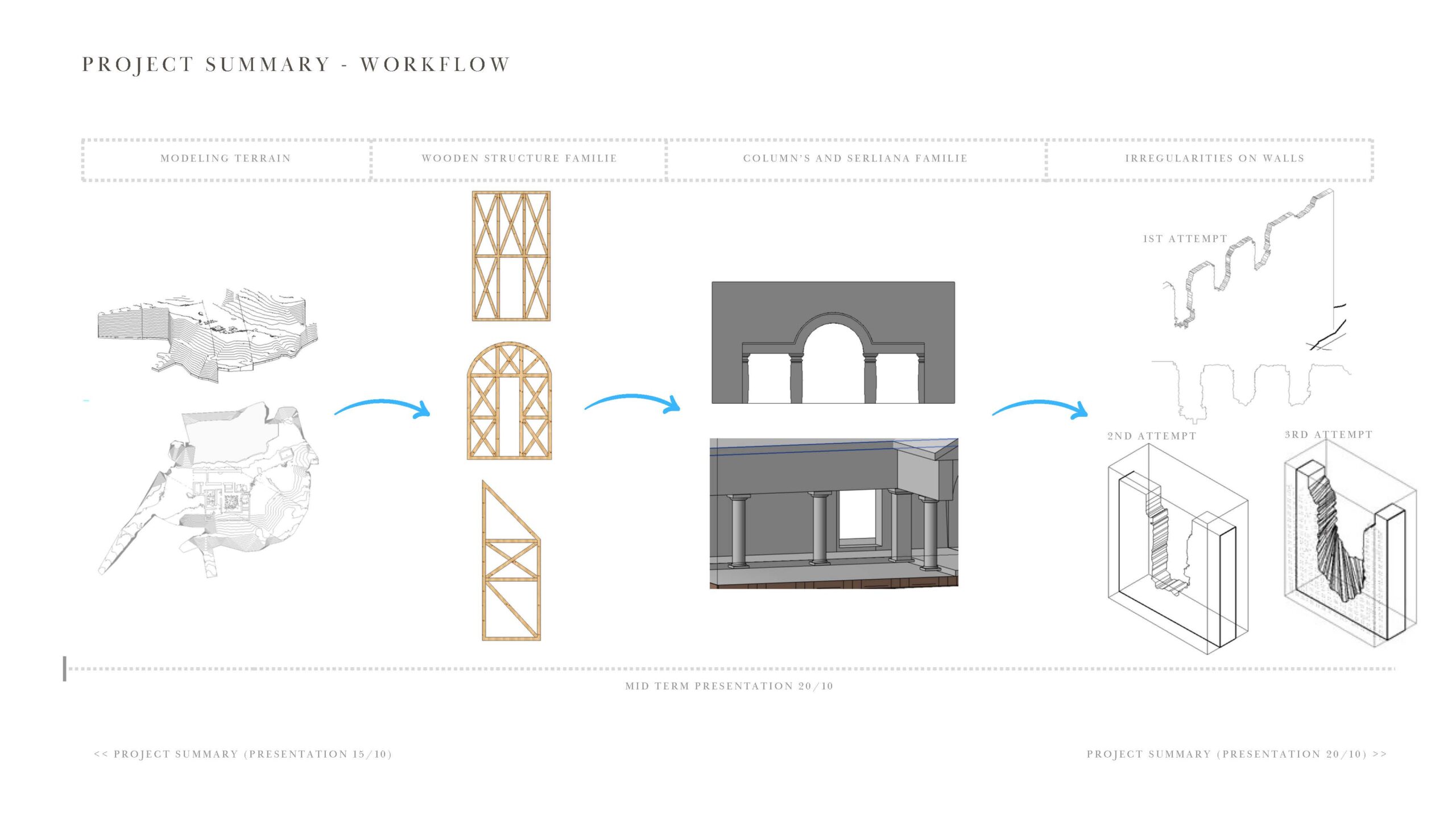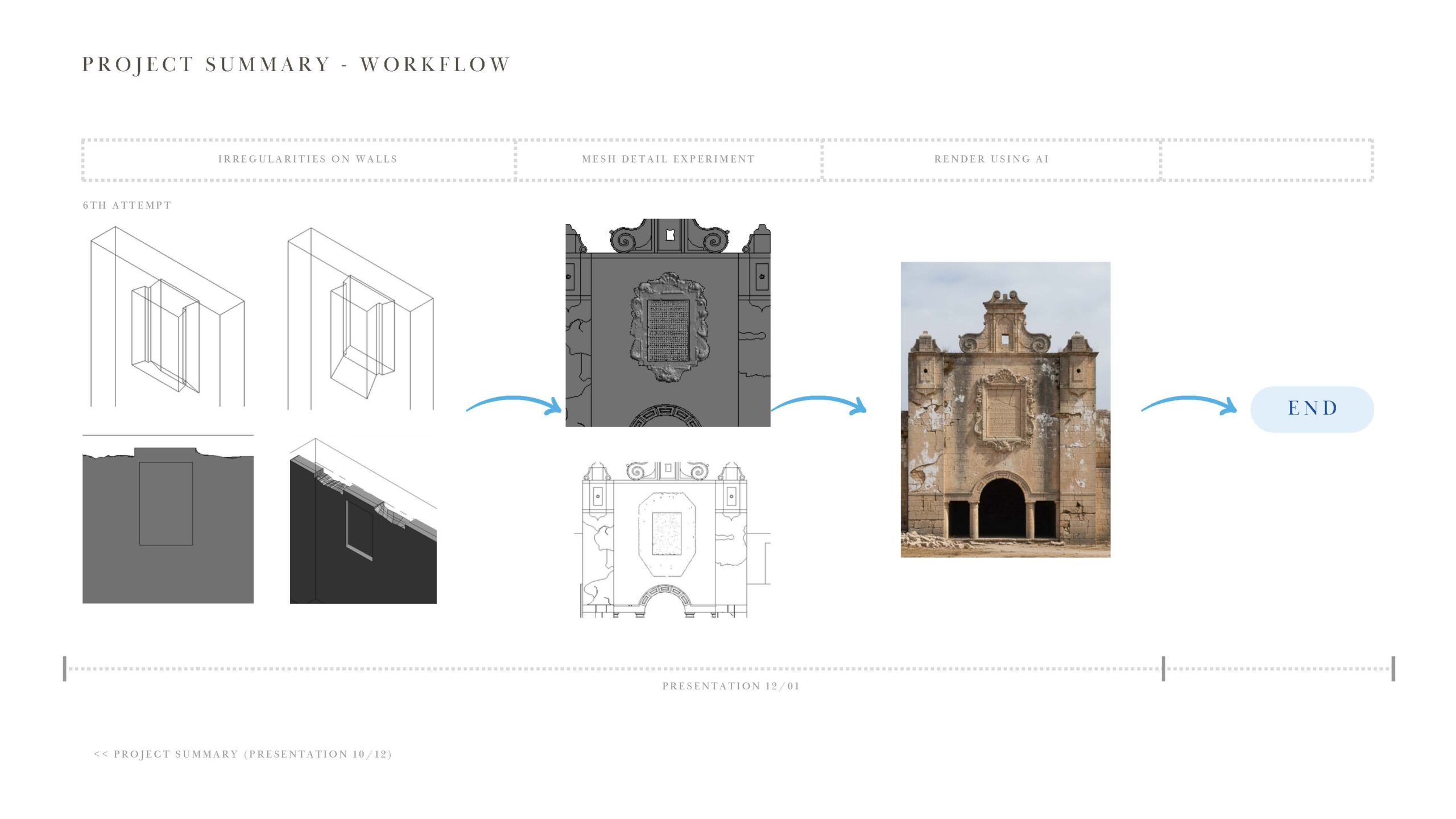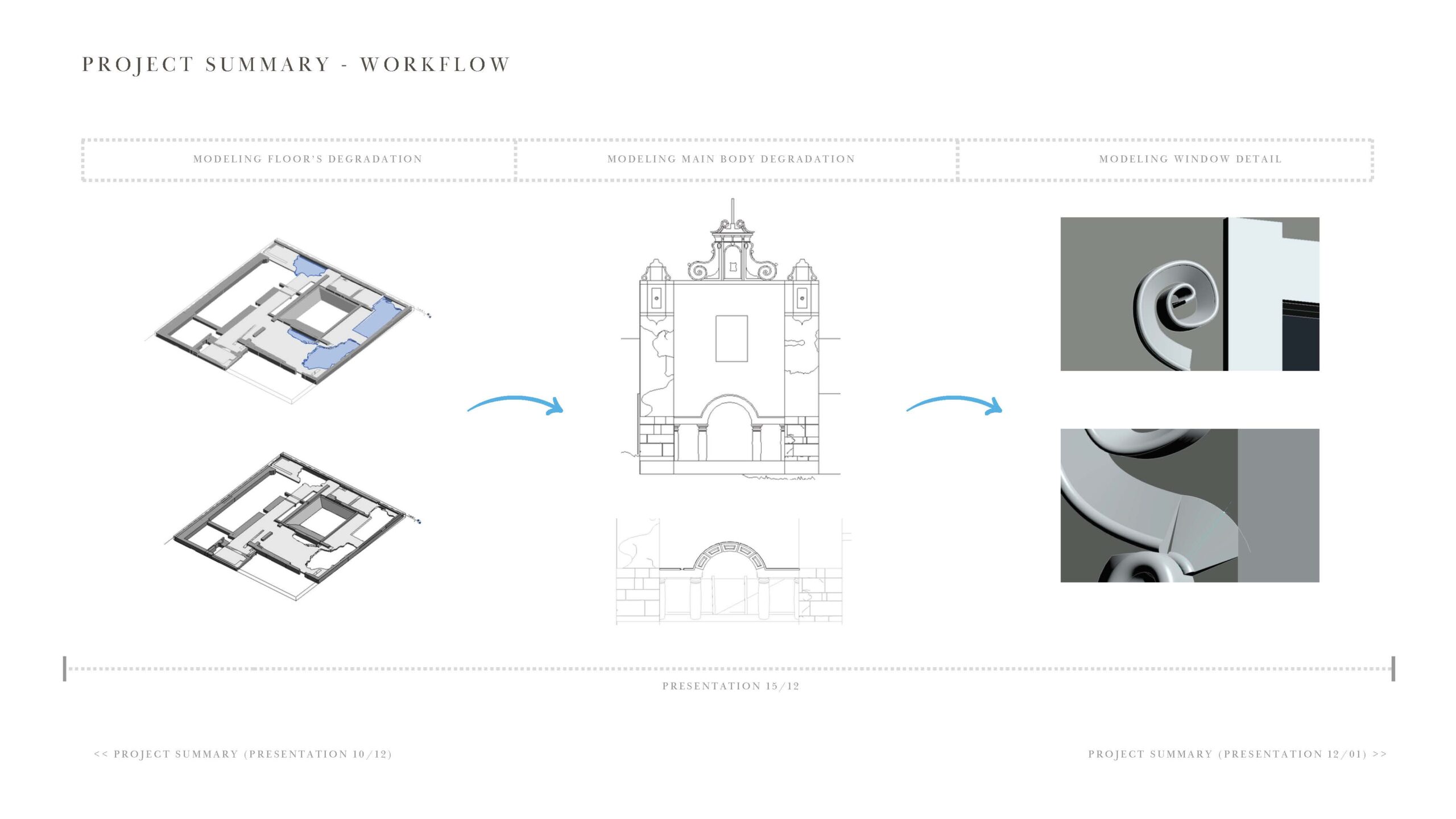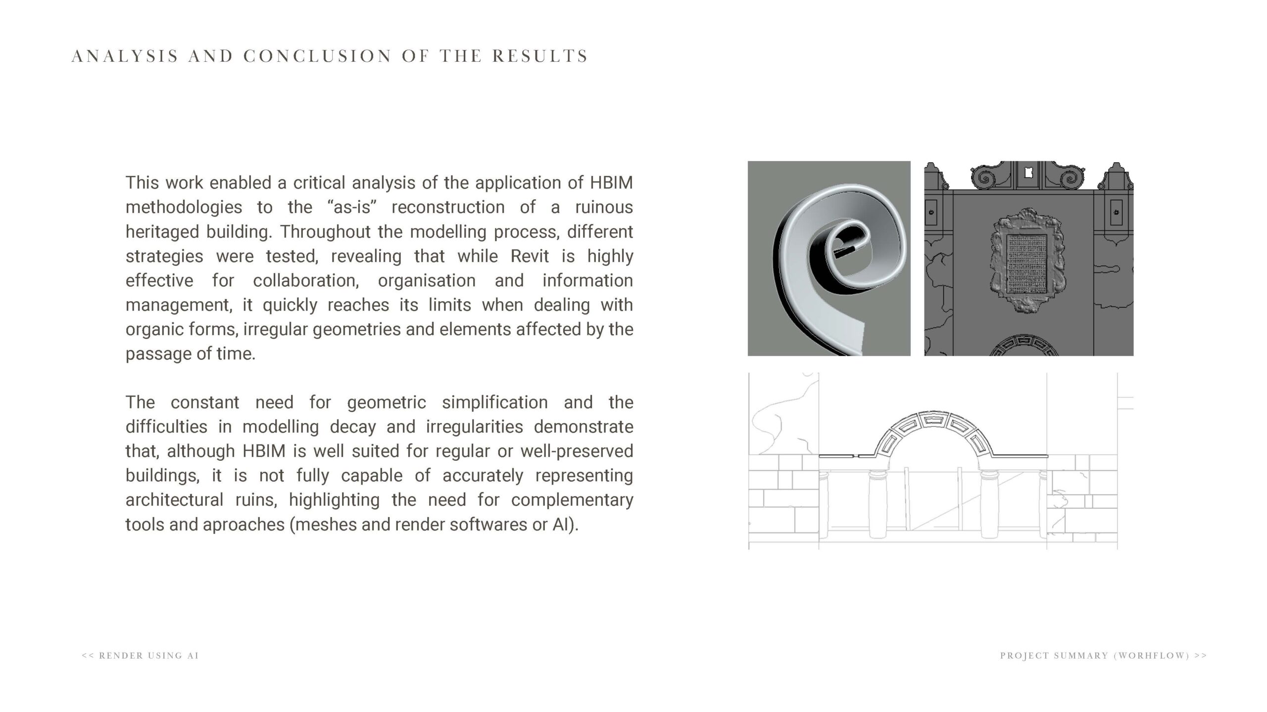 4) Capuchos Convent as-found recording: The Capuchos Convent is an extreme as-found modelling scenario since the building is in an advanced state of ruin involving material loss, overgrowth, deteriorated decorative features, and other complexities. The students fully tested the limits of conventional BIM software, which is better suited to standardized components and regularized building assemblies. They opted for an exploratory approach developing a hybrid workflow that combined point cloud interpretation with mesh-based modelling. The process began with cleaning and segmenting the scan data to remove vegetation, isolate the temporary timber supports used to stabilize the structure, and reduce overall noise with automatic reduction tools. The point cloud was then divided into modelling zones for easy coordination. Highly decorative fragments of the facade, which exceeded practical parametric modelling limits, were reconstructed as triangulated meshes derived directly from cleaned point clouds and imported into the HBIM environment. The project was key because it led us to conclude that there is no uniform method for reliably capturing geometry in Revit while also preserving the visual character of ruin “as-is”. Instead, a more simplified and strategic approach is needed, using targeted 2D documentation for some areas and mesh-based modelling for geometrically complex or highly deteriorated zones.