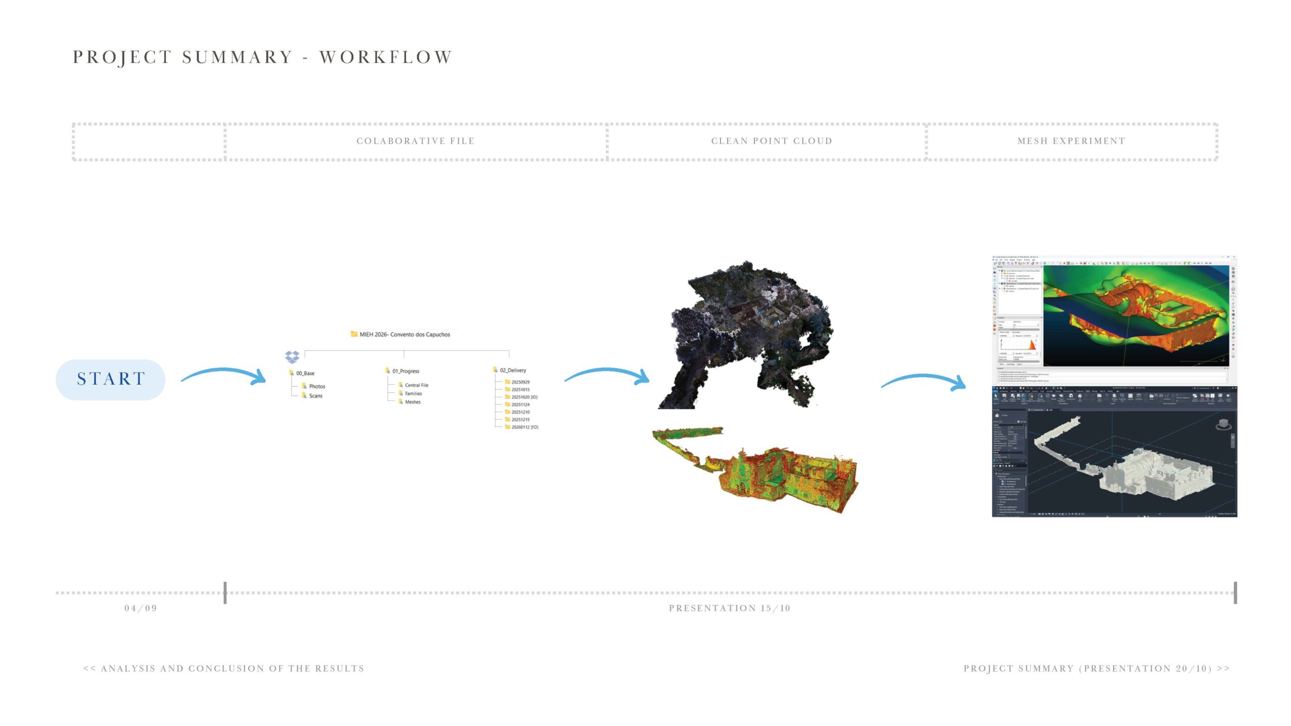 To begin this endeavour, students were introduced to the field of study and the case study. They proceeded by learning modelling practices from point cloud data, then applied these skills through nine group projects related to the theme of monastic water heritage at the convents. Their work connected physical evidence, historical interpretation and extended tools for HBIM dissemination to achieve a better understanding of how these systems once functioned. To anchor the work in a shared evidence base, the teams integrated a prior analog survey of the hydraulic systems by Pina in 1996, results from Inês Almeida’s virtual reconstruction, an extensive laser scanning campaign of both hydraulic systems undertaken in summer 2025, and preliminary studies produced through an earlier hors les murs exchange studio.