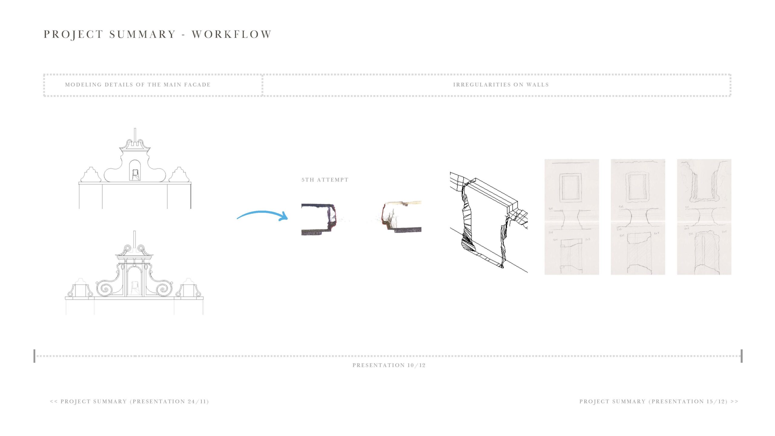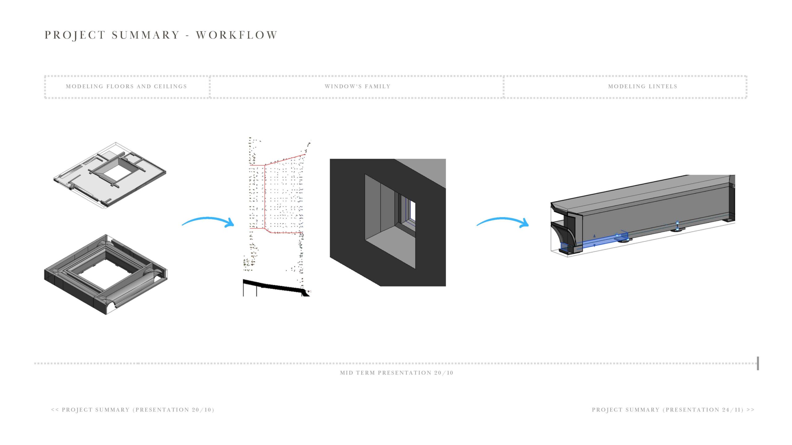 3) São Paulo Convent as-found recording: This “as-found” recording project focused on testing the limits of modern BIM software to capture the irregularity of heritage structures. As-found recording is an approach that documents the current, physical state of a site rather than its original intended design. In the context of heritage this preserves measured irregularity as much as possible, rather than normalizing the building into geometry that is easier for the software to produce. Although recent rehabilitation made the overall volume appear rectilinear, point cloud sections revealed persistent deformation, non-planarity, and localized inconsistencies that required iterative modelling, especially in cases of non-perpendicular wall alignment and the insertion of windows and doors. Exterior walls and buttresses were modelled first, then adjusted against interior walls through repeated cross-checking in plan and section views of the point cloud. Each team member took responsibility for a category, e.g. windows, doors, walls and floors. Collaboration workflows from the beginning were needed to ensure that these different modelling categories aligned. It also required careful anticipation of how window and door families could be fitted within non-orthogonal wall conditions. On-site analog recording also played a key role in refining the digital model: profile measurements of arches, door frames and other details were used to verify whether deviations in the scan data reflected meaningful deformation or scan noise.