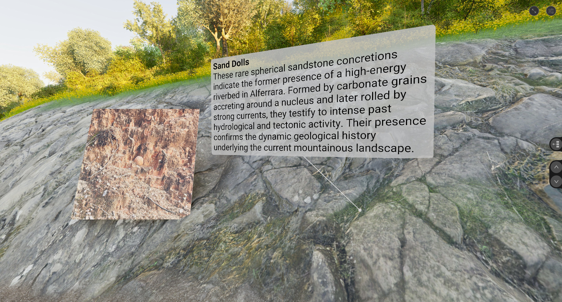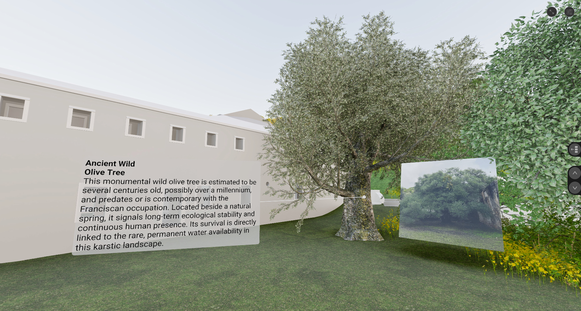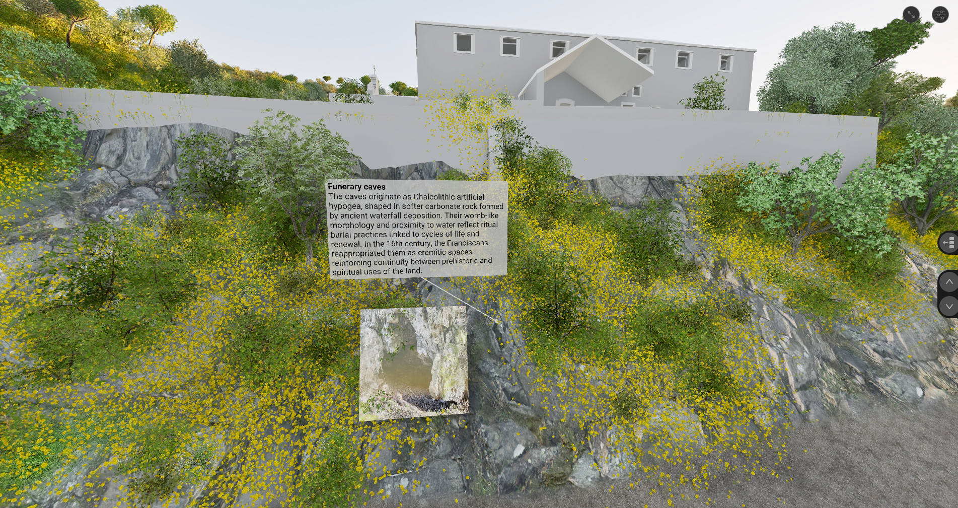 9) Visualizing the Quinta’s Geological History: This geology-focused project was developed as a digital storytelling strand that reframed Quinta de São Paulo as part of a hydrogeological cultural landscape shaped across deep time. Drawing on field observation, site visits, and interviews with the site manager and local experts, the students explained how the Arrábida region’s permeable limestone and dolomitic formations, together with fractures and faults, concentrate water in springs and other hydraulic points that made long-term occupation possible. They then connected this legacy to prehistoric life including man-made caves, agricultural practices, and later monastic life. The final prototype was conceived as a virtual educational landscape connecting HBIM and Twinmotion to integrate building, terrain and vegetation. The experience produces guided render sequences and embeds annotated hotspots linking notes and images to features such as sand dolls, karst caves, the Mãe d’Água, breccia elements, and other site details.