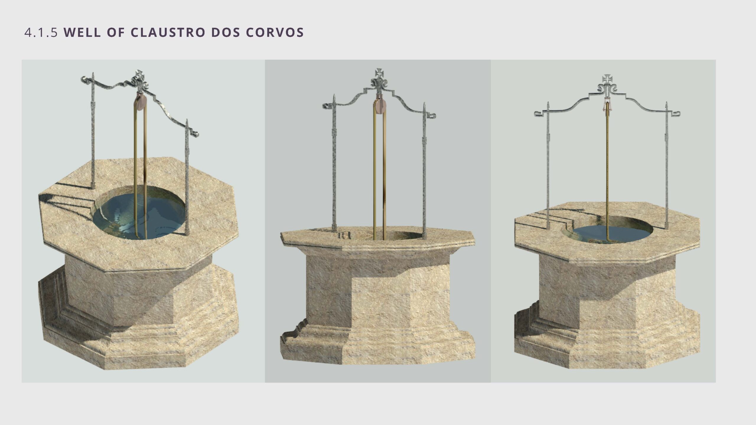 2) Reconstruction of the Capuchos Convent water system: The hydraulic system in this case is simpler than at São Paulo because the Capuchin friars relied more heavily on alms from local communities and wealthy patrons and therefore did not need to sustain themselves solely on food they produced. Nonetheless, the existing ruins pose significant ambiguity about how water flowed through the site. There are many missing connections between visible elements that have to be assumed at this stage by logical inference. To clarify how the system functioned as a whole—while also respecting the truths revealed by the ruins themselves—the project adopted a “middle-way” approach, modelling the ruin in its present condition along with a plausible reconstruction of its former state. To distinguish physical evidence from speculation, the project used generic features and material transparency wherever there was doubt but explored full material tectonics in the case of visible elements. The final model was exported into an Unreal Engine environment to facilitate interactive communication of the results. This included a custom user interface featuring a “lens of the past” toggle, allowing users to contrast present-day ruins with their reconstructed hypotheses by visualizing missing structural data.